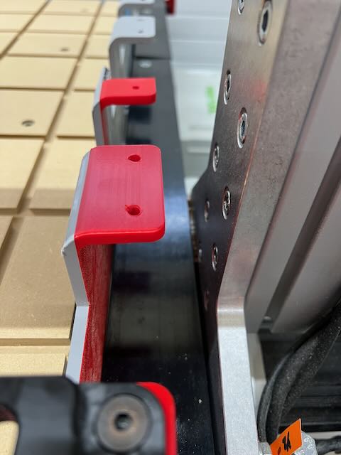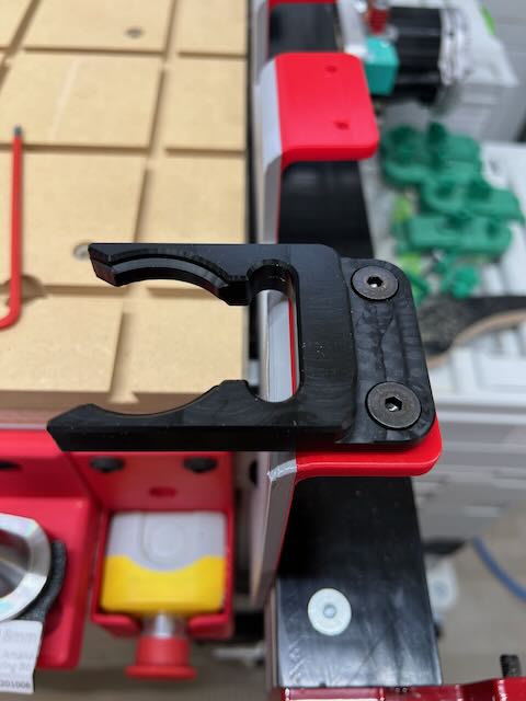 I just looked at the tool cups, and then it occurred to me that a lot of the room I’m stealing from my work surface is due to the minimum bend radius for send cut send. So… for grins and since my tool fork rack is a mirrored design, I reversed it and attached the forks to it and reclaimed 2”+ of work surface!