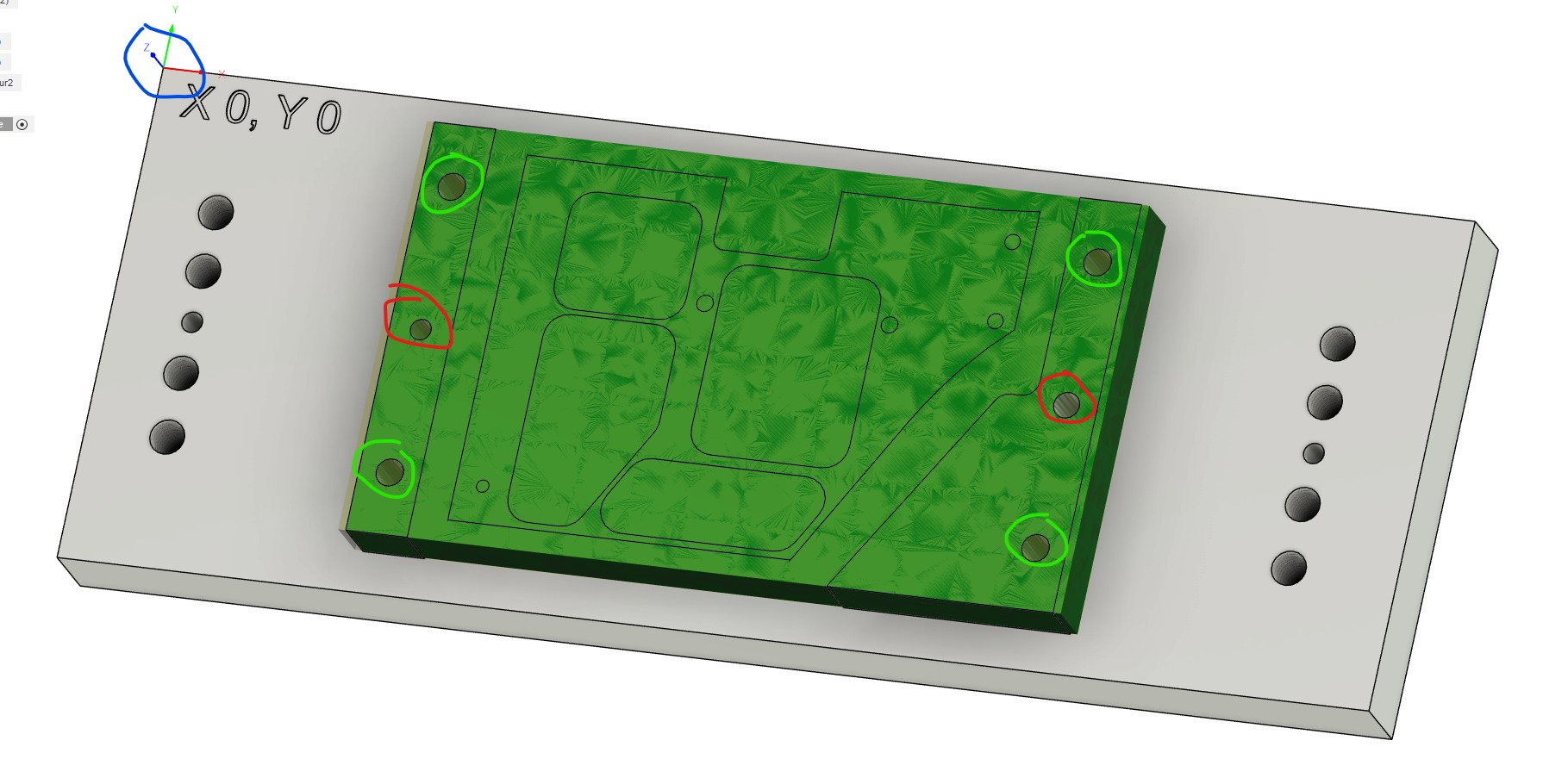 The stock is mounted to the fixture plate indexing of the red holes on the dowel pin and Diamond pin. The blue circled corner of the fixture is the WCS for the operation and was established when making the fixture plate. So I know where the index pins are based on the corner of the tooling plate and I can always find it again off the plate edges/corner.
