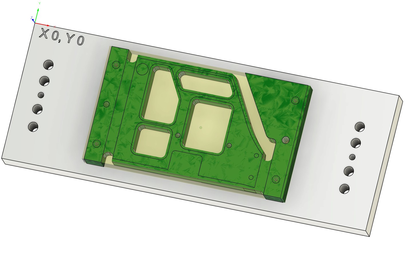First op1 in the vise will be to drill the index holes in red and the green hold down holes. Using the corner of the stock for the WCS for this operation. The hole patterns match the fixture plate.