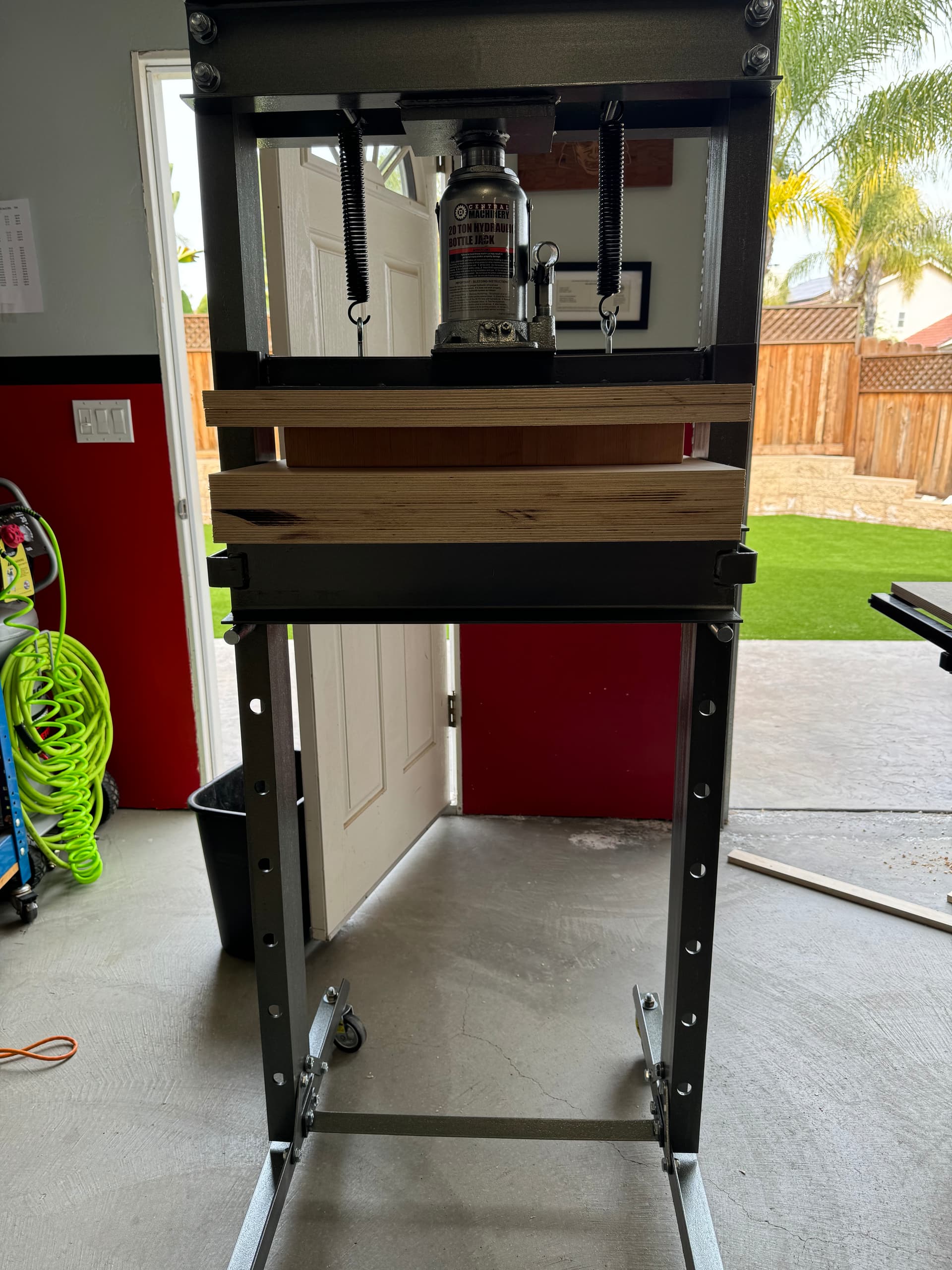 I bought a cheap press from Harbor Freight and mounted some baltic birch plywood to give me some extra surface. The bottom pieces are not screwed to each other so I can add or remove them depending on the thickness of the project. I had tried using every avail clamp in the shop but never got the pressure it needs to secure the wood plug. This has worked great so far.